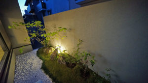 心落ち着く和の坪庭があり,地窓から見える和風照明の心や安らぎます。