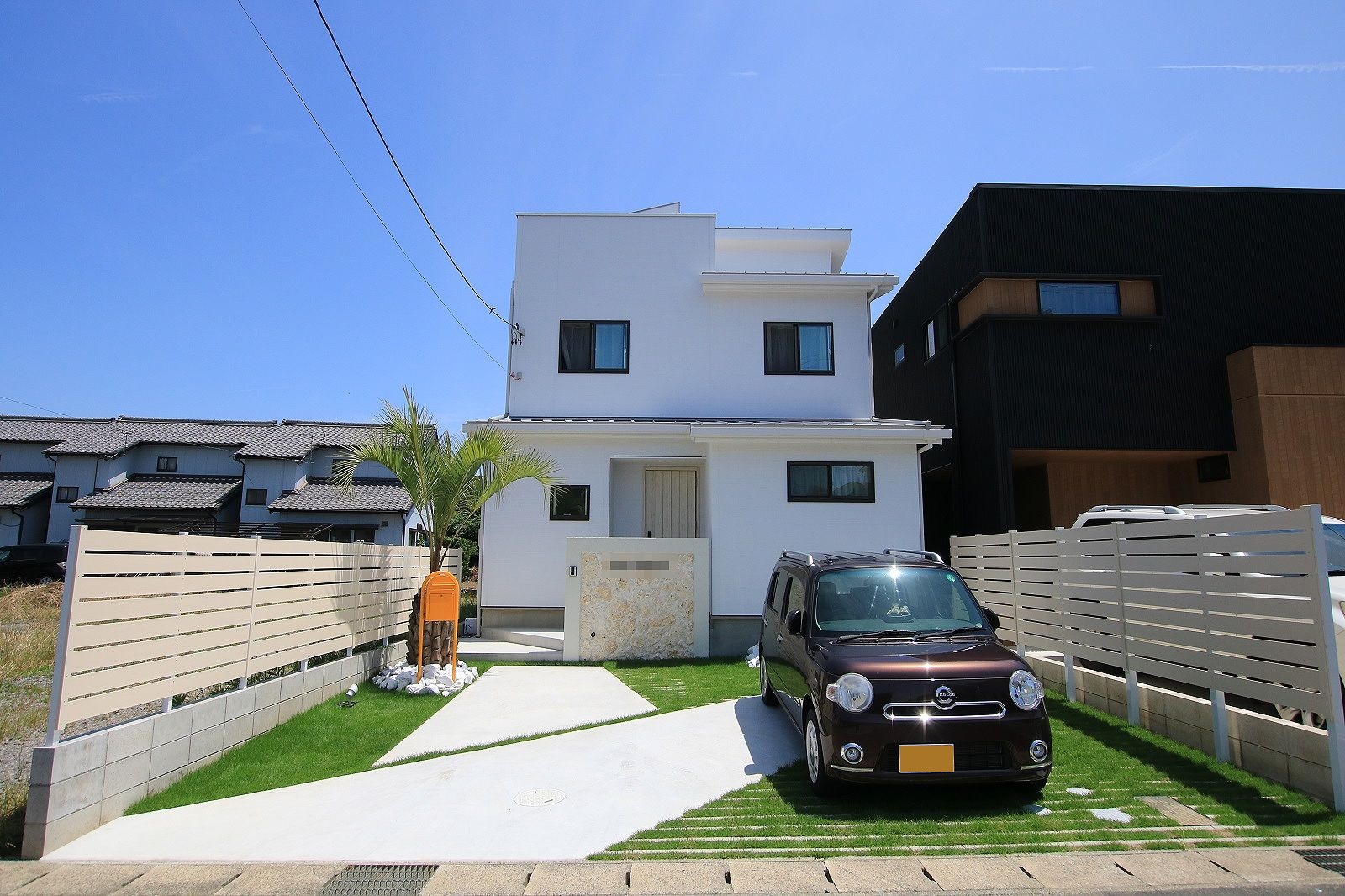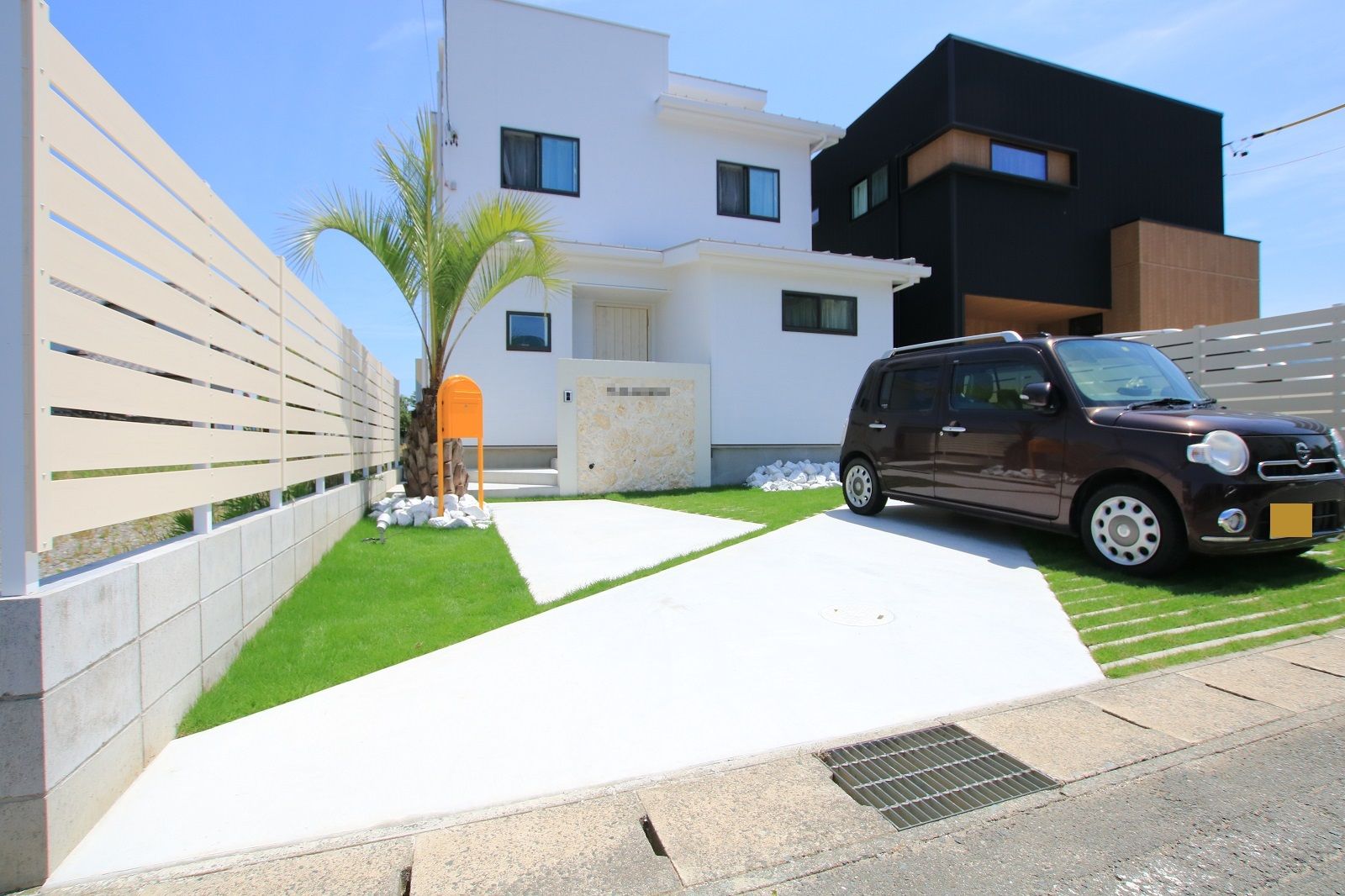 白と緑で統一したリゾート風の外構です。
