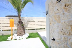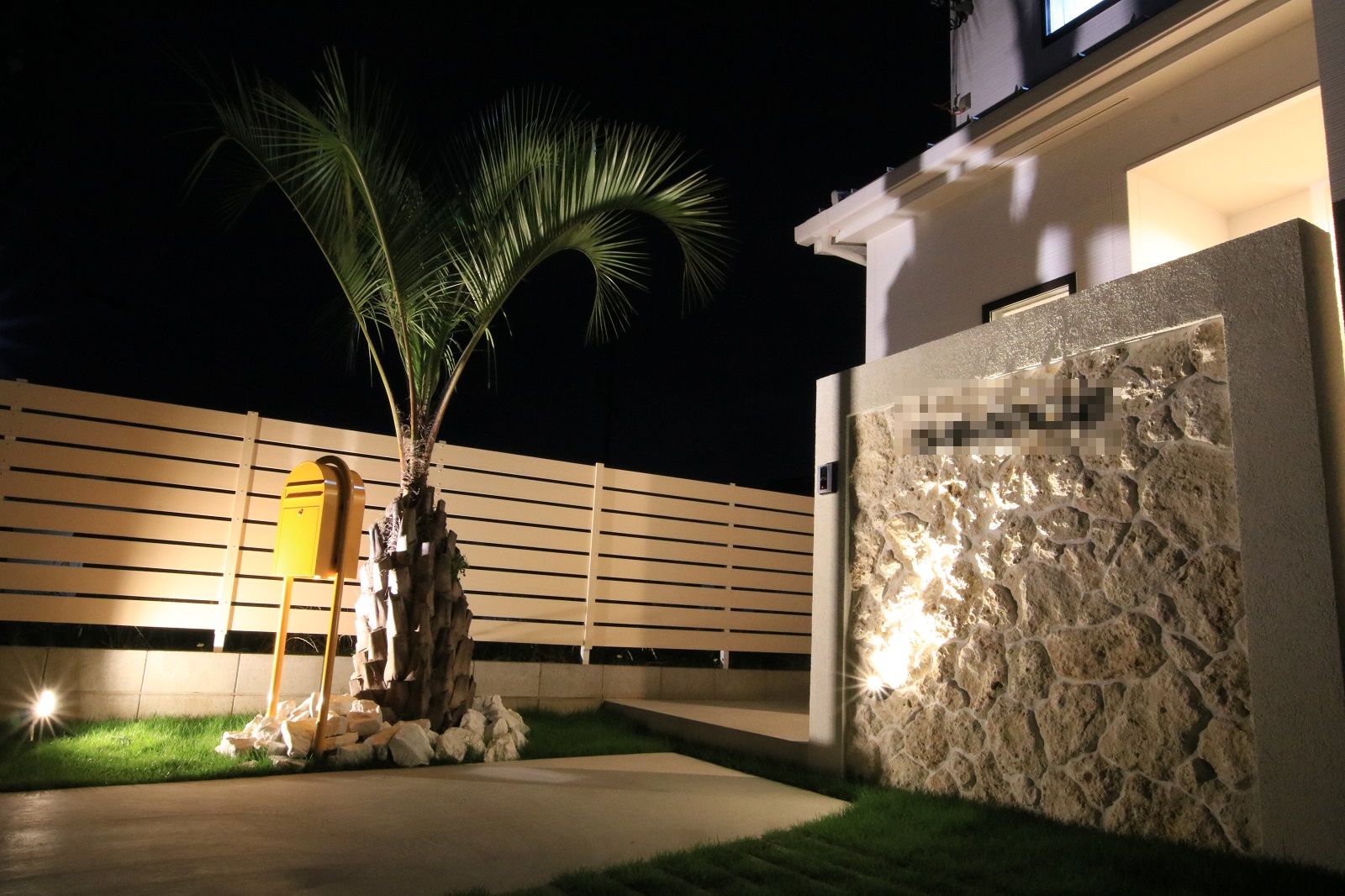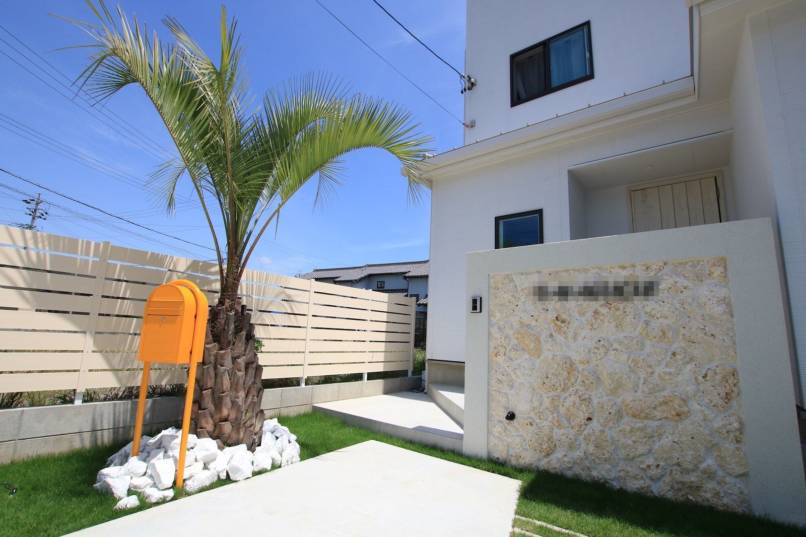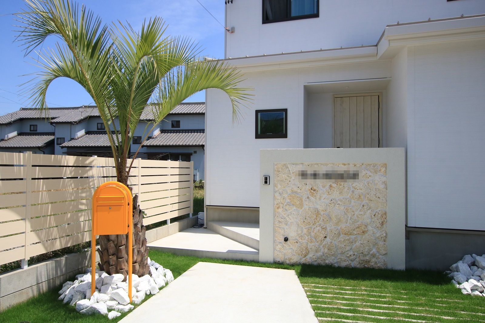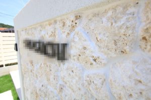 玄関扉前に門柱を設け、塗装と、琉球石で