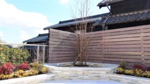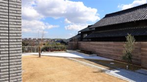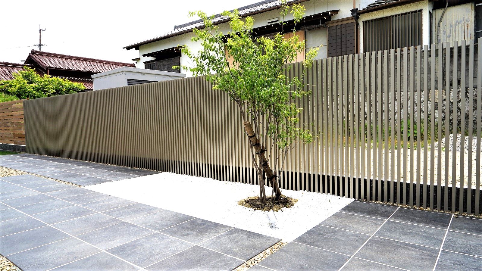 境界はあえてフェンスは使用せず、アルミの角材を加工した千本格子風 目隠し。
