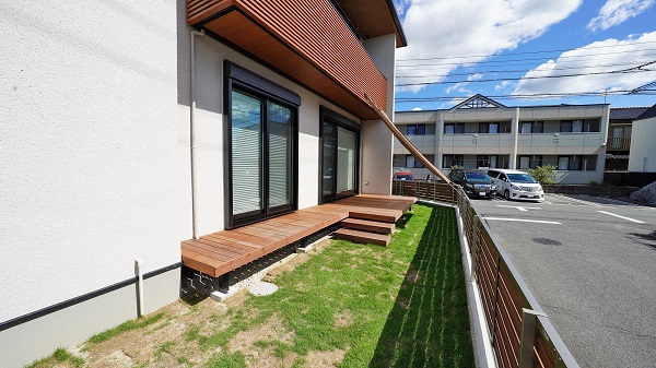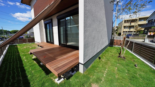 庭には 天然芝と、天然木デッキ。
