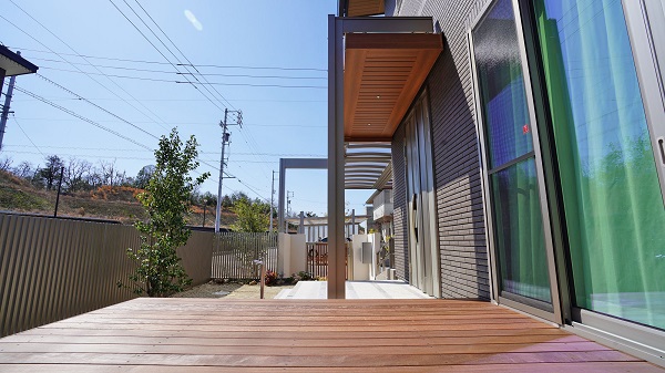 庭部には、天然木ハードウッドを使った快適なウッドデッキ。