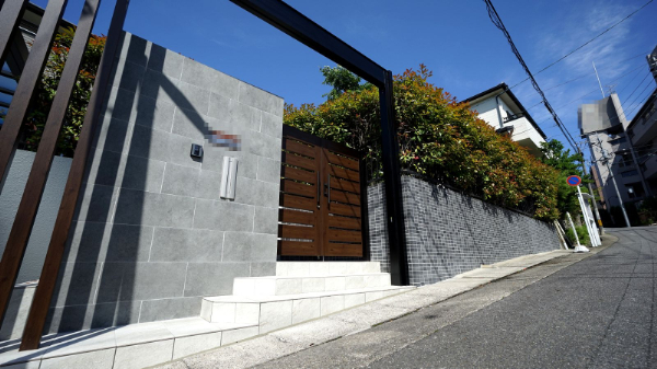 門柱には『ニッタイ ニヨン』の大判タイルで高級感と爽やかさを演出。