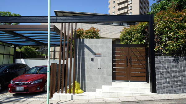 カーポート、門柱、門扉、階段ポーチ、庭部の壁を新しくリフォーム。