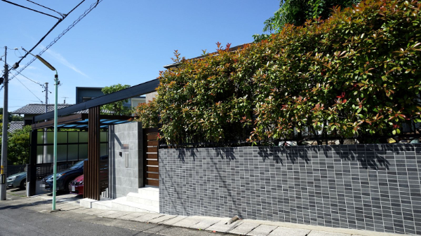 門柱には『ニッタイ ニヨン』の大判タイルで高級感と爽やかさを演出。