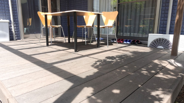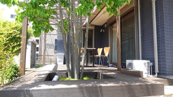 本物に近い質感のデッキに腰を掛け、庭を楽しむことができます。