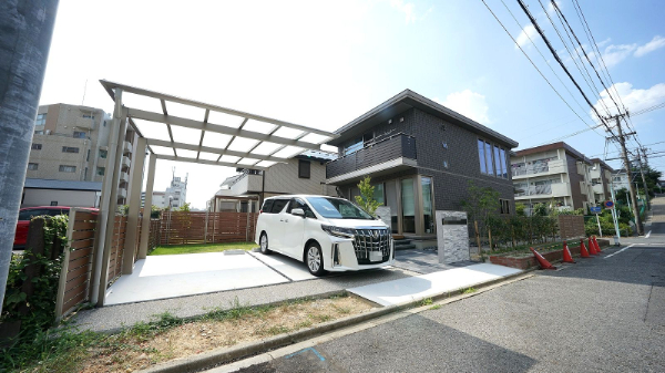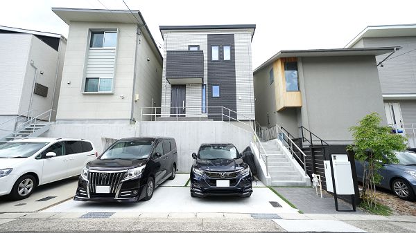 尾張旭市 S様邸 裏は実用性を重視。 車2台と自転車2台が駐車可能な全面土間コンクリートの駐車場。 今回のこだわりはスリットの位置にあり …