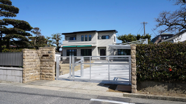尾張旭市 T様邸 既存の門柱を利用したクローズ外構 正面には『LIXIL オーバードア』と門扉を設置。 以前までは手動のスライド式門扉で …