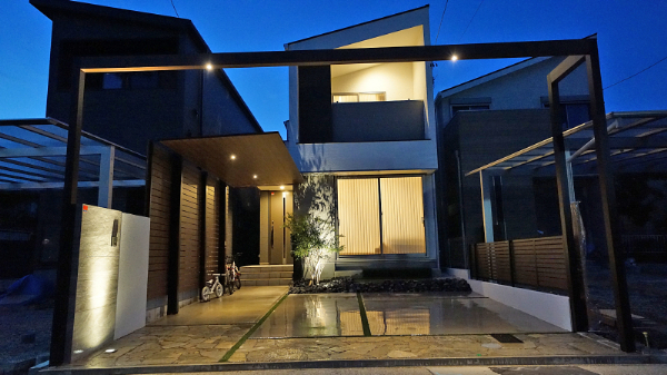 千種区 T様邸 新商品を使い、機能性・統一感重視のプランへ 正面には『LIXIL Gルーフ』でアプローチのアーチを造作。 ダウンライトを …